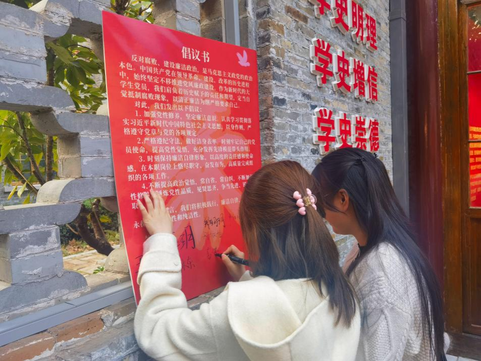 参观结束后,23级研究生党支部书记张朝晟带领党员同志们签署党员廉洁自律倡议书,并强调要深入学习贯彻习近平总书记关于从严治党、党性教育及党风廉政建设的重要思想,结合党史学习教育,从党史中汲取养分,自觉践行“四个意识”,坚决做到“两个维护”,对党绝对忠诚。