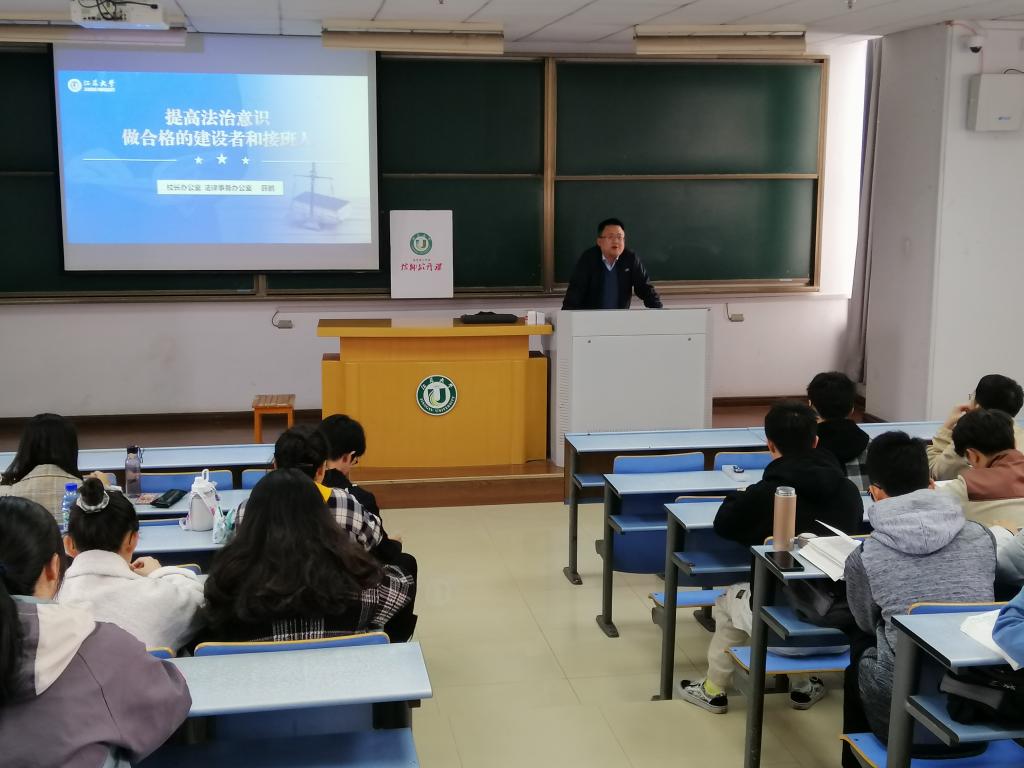 在三江楼515举办法治宣传教育主题讲座,邀请校长办公室、法律事务办公室副主任薛鹏担任主讲,杏色团学组织部门主要学生干部、各班班长团支书参加本次讲座。