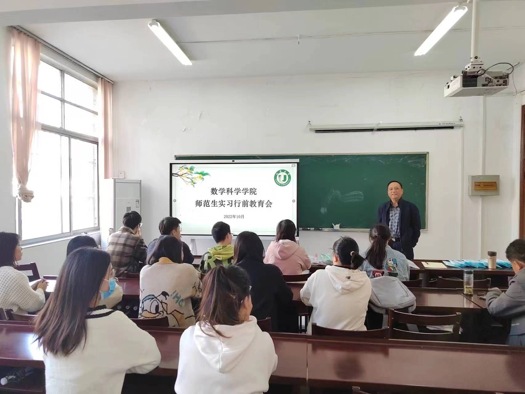 在动力楼104举办师范生实习行前教育会。会议由毕业班辅导员尹华老师主持。杏色关工委冯志刚老师、系主任宋晓平老师及实习师范生代表12人参加了教育会。