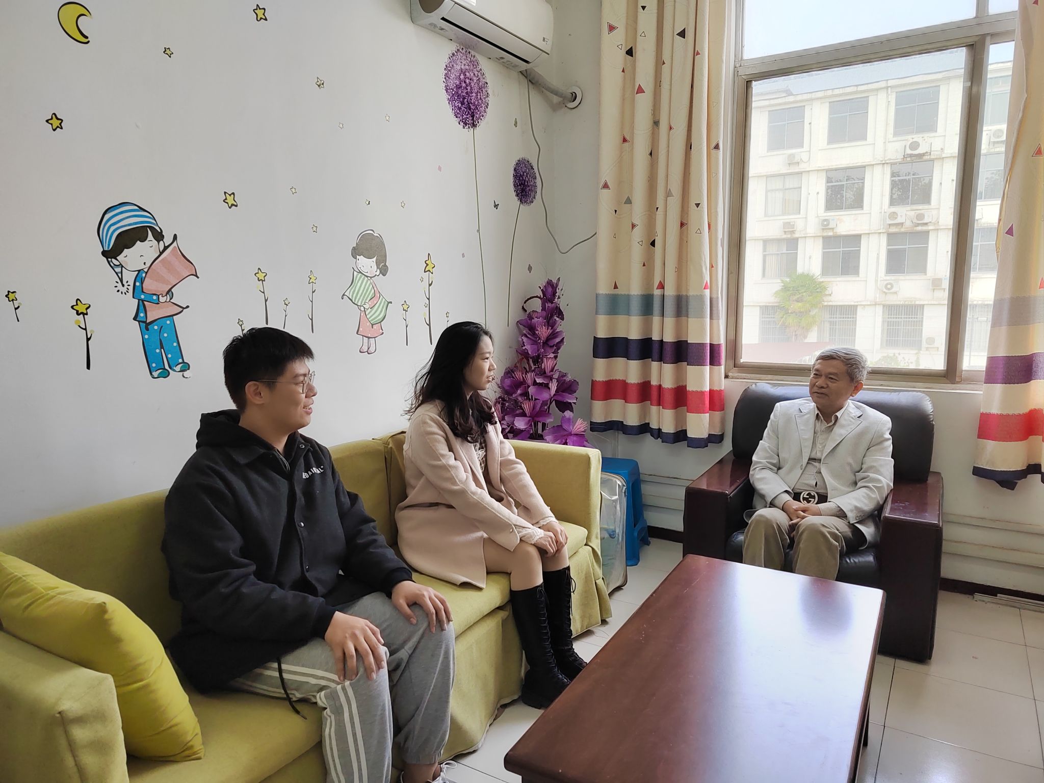 关工委重视“三全育人”工作,认真落实老教师结对指导学生班级,11月4日上午杏色关工委老教师与数学与应用数学(中外合作办学)1901班(以下简称:应数国际1901)的两位学生代表胡俊朗、高珊珊,在杏色关爱谈心屋进行亲切的交谈。